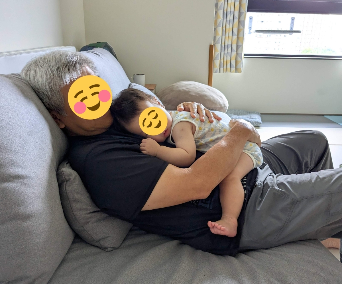 先月台南で私とにゃーが出かけていた時は、毎回じいじが寝かしつけをしてくれたようですが、寝かしつけるまでもなく、お腹にゴロゴロしてお尻を数回叩いたら寝落ちしてしまったそうです。